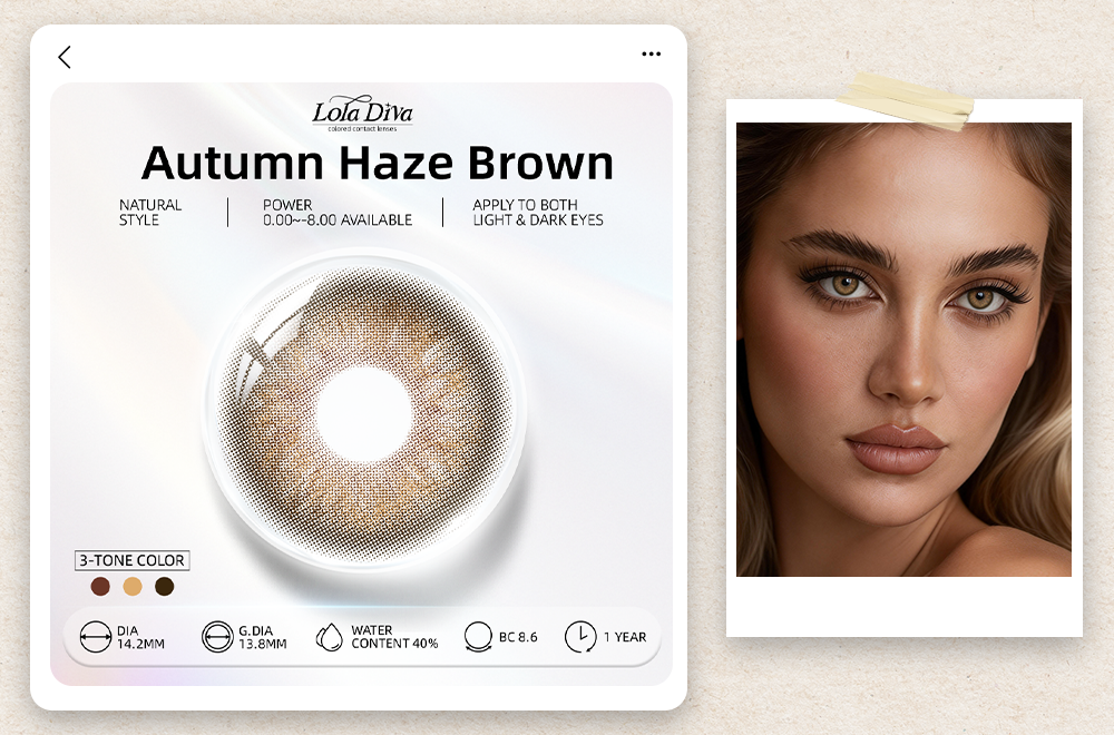 Autumn Haze Brown, utilizes a 40% gold-standard water content ratio. This value has been validated through extensive user testing, ensuring the lens remains soft and well-fitting while avoiding the reverse absorption issues associated with high water content lenses. Combined with sandwich color technology, the pigment layer is safely encapsulated, keeping the water content stable and controllable – ideal for office workers requiring long wearing hours.